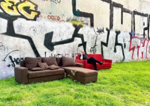 Vor dieser dramatischen Kulisse steht eine ungewöhnliche Ansammlung von Möbeln, die so deplatziert wie faszinierend wirkt. Eine L-förmige Sitzgarnitur aus braunem Stoff, die Ecken abgewetzt und die Oberfläche von der Zeit gezeichnet, erzählt von vielen vergangenen Gesprächen und geteilten Geheimnissen. Links davon befindet sich ein auffälliger roter Dreisitzer, der im satten Rot fast provokativ in der ansonsten gedämpften Umgebung leuchtet.