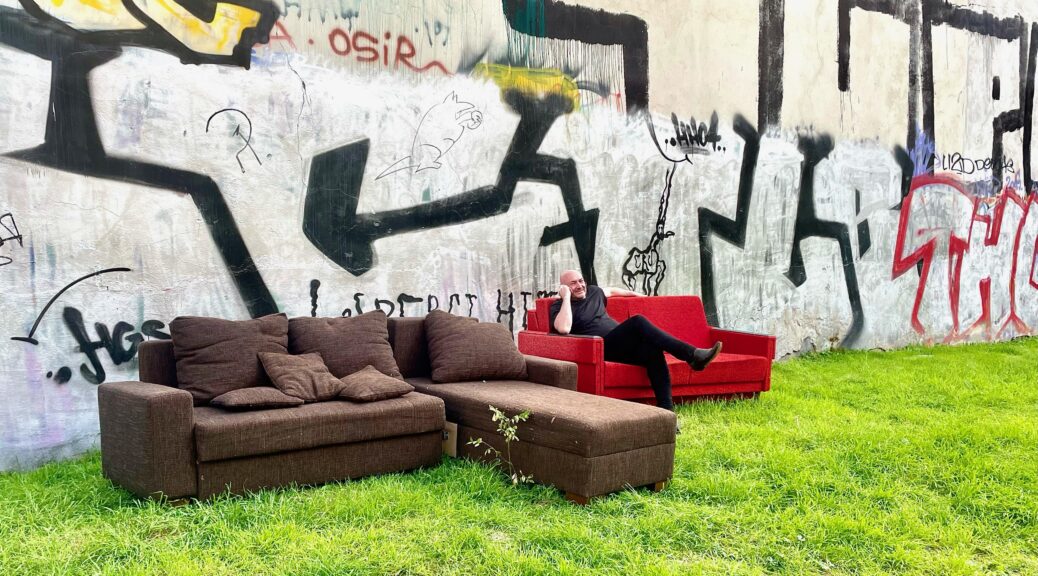 Vor dieser dramatischen Kulisse steht eine ungewöhnliche Ansammlung von Möbeln, die so deplatziert wie faszinierend wirkt. Eine L-förmige Sitzgarnitur aus braunem Stoff, die Ecken abgewetzt und die Oberfläche von der Zeit gezeichnet, erzählt von vielen vergangenen Gesprächen und geteilten Geheimnissen. Links davon befindet sich ein auffälliger roter Dreisitzer, der im satten Rot fast provokativ in der ansonsten gedämpften Umgebung leuchtet.